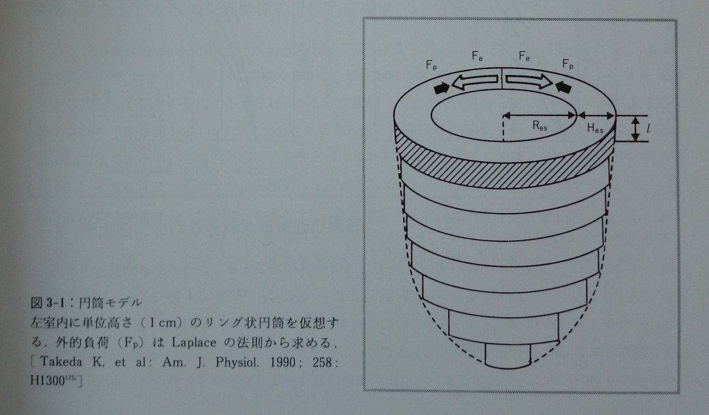 モデルにおける仮説を定義する174)。1)左室内に単位高さ(1cm)のリング状円筒を仮想する(図3-1)。円筒を形成する左室壁心筋において円周方向の収縮末期の力(Fes)と心筋長(Les)は直線的比例関係にあり,その比例定数をEcとする(式2-1)。2)左室壁に加わる外的負荷(Fp)はLaplaceの法則から求める。3)収縮末期とは左室壁心筋に発生する収縮力と左室壁の収縮を妨げる外的負荷とが均衡した点である(Fes=Fp)。以上の仮説から左室収縮末期力-長さ(式2-1),応力-歪み(式2-2),圧-長さ(式2-3),圧-容積関係(式2-4)を表す数式が得られる174)(図3-2)。