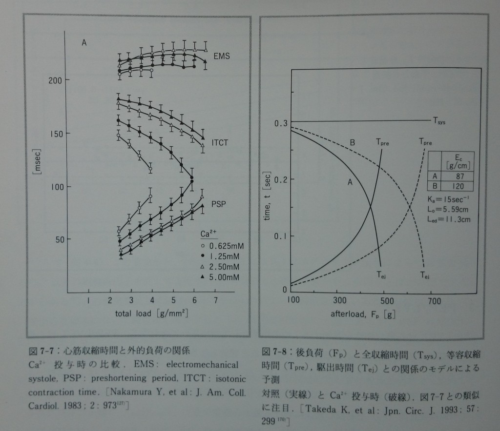 摘出心筋標本において後負荷を増加するとTsys時間は相対的に一定であるが,PEPは増大し,ETは減少する127)。この標本にCa2+を投与すると対照と同じ後負荷条件で,Tsys時間に変化は少なく,PEPは減少し,ETは増大する127)(図7-7)。この関係をモデルから理論的に予測すると図7-8の結果となる168)。図の様にモデルは実際の心筋標本における収縮時間の変化を理論的に良く説明できる。
