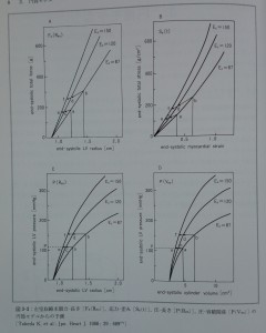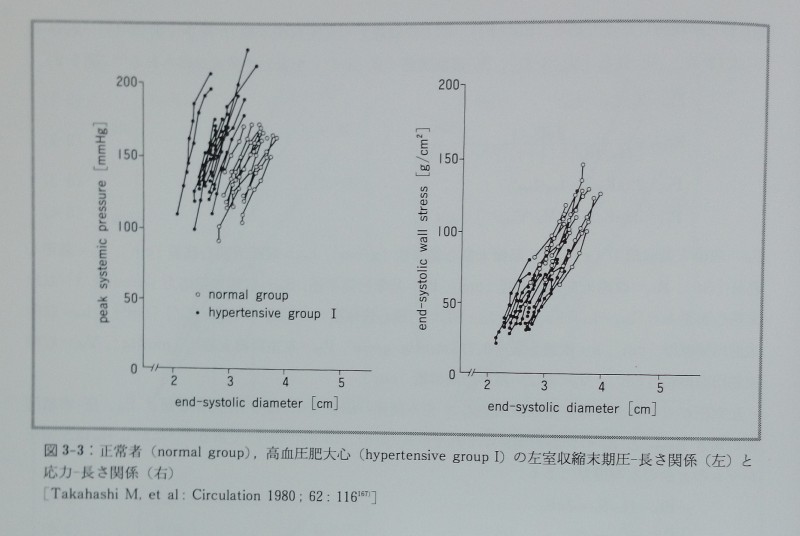 正常心と比較し高血圧による肥大心では応力-長さ関係の傾きは不変であるが,圧-長さ関係の傾きは増大する(図3-3)146, 167)。式2-5,2-6,2-7から,壁厚(Ho)の増大により応力-歪み関係の傾き(Eto)とRoが一定であっても,力-長さ関係の傾き(Ec),圧-長さ関係の傾き(Eso),圧-容積関係の傾き(Emaxo)はすべて増大することになる。Etoは単位心筋の,Ecは単位心筋の集合である或る固有の厚さをもった左室壁心筋の収縮性能を示すものであり,この2つは心収縮性評価の対象が異なる。従って,上述のようにEtoとEcとの間に増減の乖離が生じる。Etoは心筋収縮性の絶対的評価に,Ecは固有の壁厚をもつ個人の左室壁性能の評価に適する。