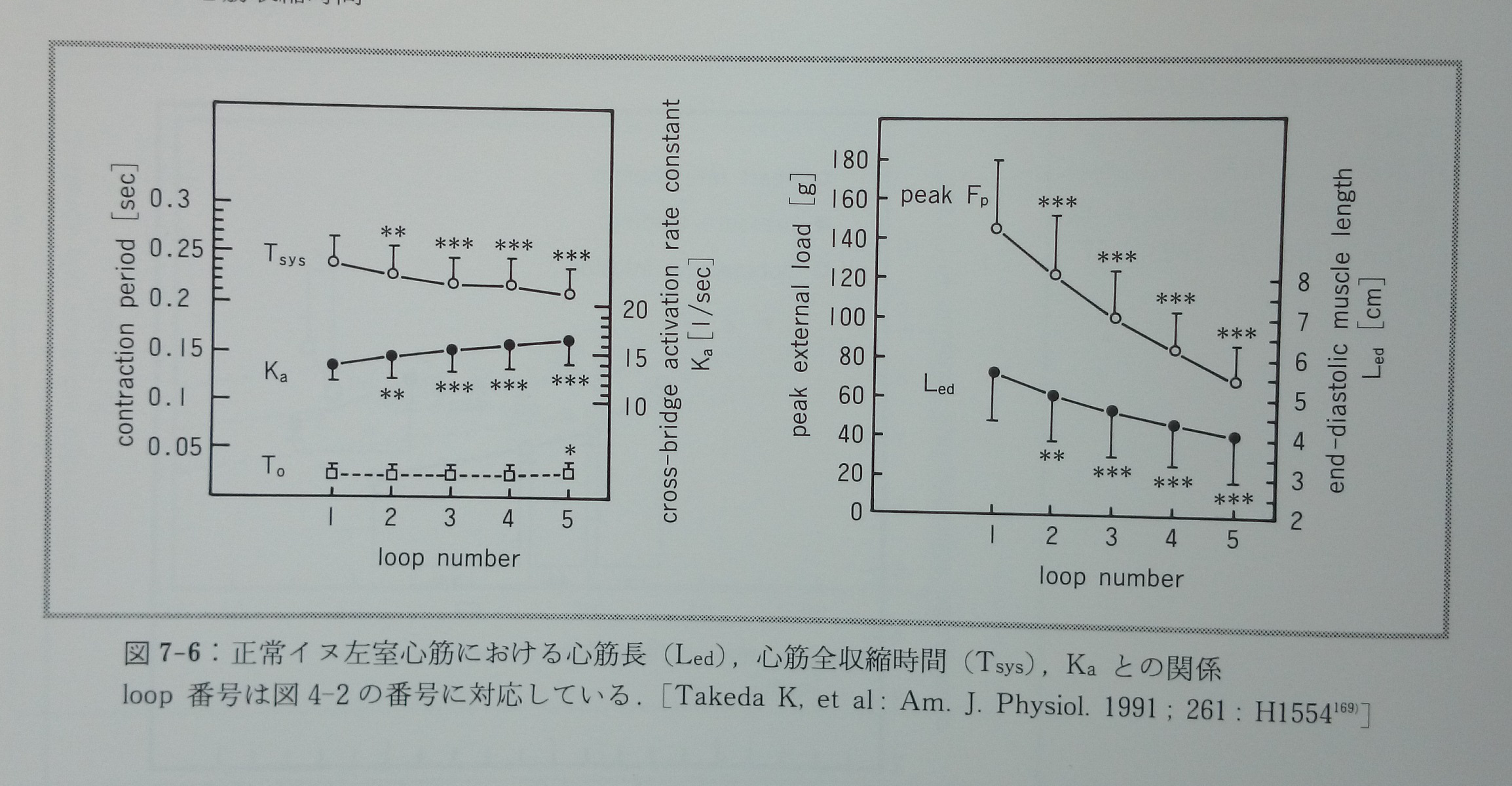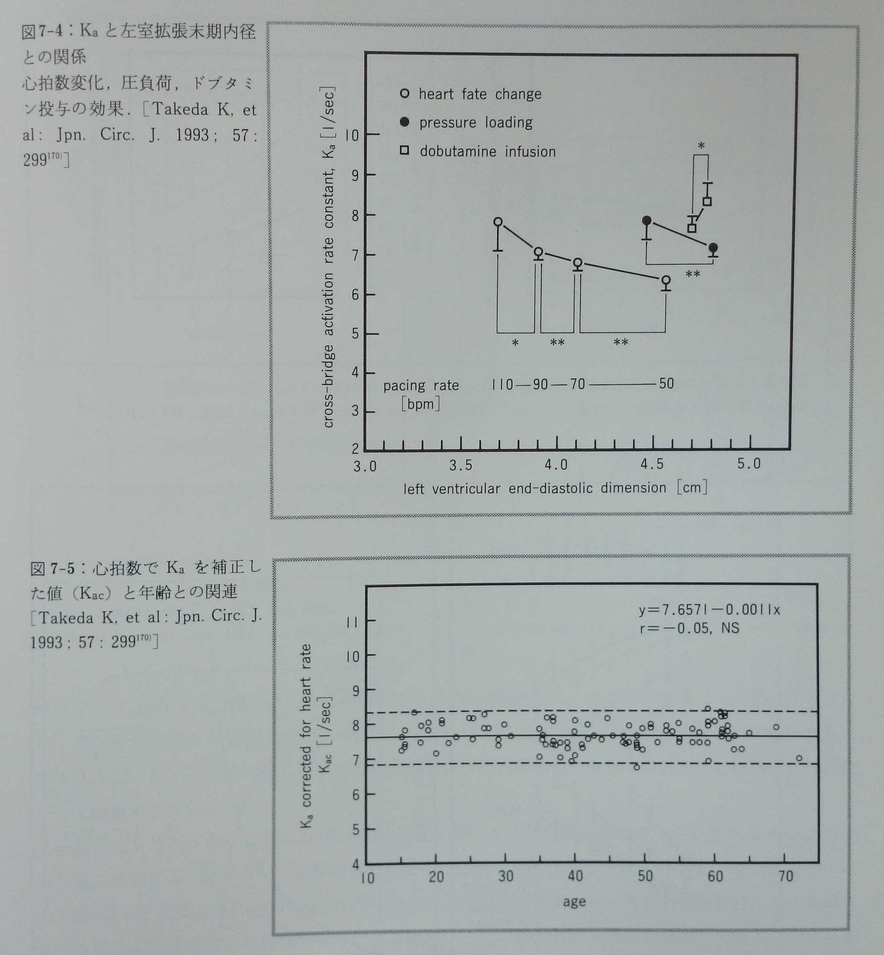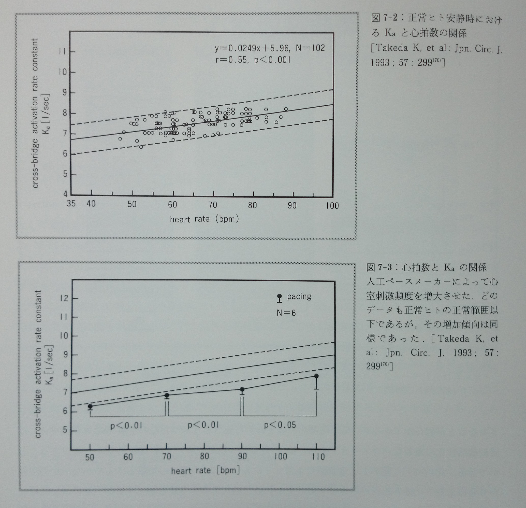 心筋の全収縮時間(Tsys)の値はKaとαのみで,またTpre/Tejの値はiのみで決定される。Tsys, Tpre, Tejをそれぞれ臨床におけるQS2時間,前駆出時間(PEP),左室駆出時間(LVET)に対応させると,モデルからQS2時間は重要な意味を持つことが理解される。式7-1ないし式7-4から,PEP,LVET,PEP/LVETはどれも左室の前負荷および後負荷(正確にはiの値)に影響されることが明らかであるが,QS2時間だけはそれから独立しており,この逆数(Kaに相当する)は連結橋活性化の重要なパラメ-タ-である。Kaの近似値は臨床においてはQS2時間から算出することが出来る(式7-5)(図7-1)。安静時の正常ヒトにおいてKaの値は心拍数とゆるやかな正比例関係の分布にある170)(図7-2)。ペースメーカーで心拍数を増大するとKaも増加するが,その増加曲線は正常ヒトのKaの分布の回帰直線とほぼ平行である(図7-3)。このペースメーカーでのKaを心筋長を横軸に取ってプロットすると,その傾向は圧負荷による心筋の伸長によって表れるKaの変化とほとんど同じであった(図7-4)。従って,安静時の正常ヒトにおいてKaが心拍数と比例関係にあるのは,心拍数によって心筋長が変化し,この変化した心筋長によってKaの値が影響を受けているためであると結論できる170)。心筋長の替わりに心拍数でKaを補正した値(Kac)は年令,性別,心筋長にかかわらずほぼ一定値である170)(図7-5)。KaとKacを求める式は,