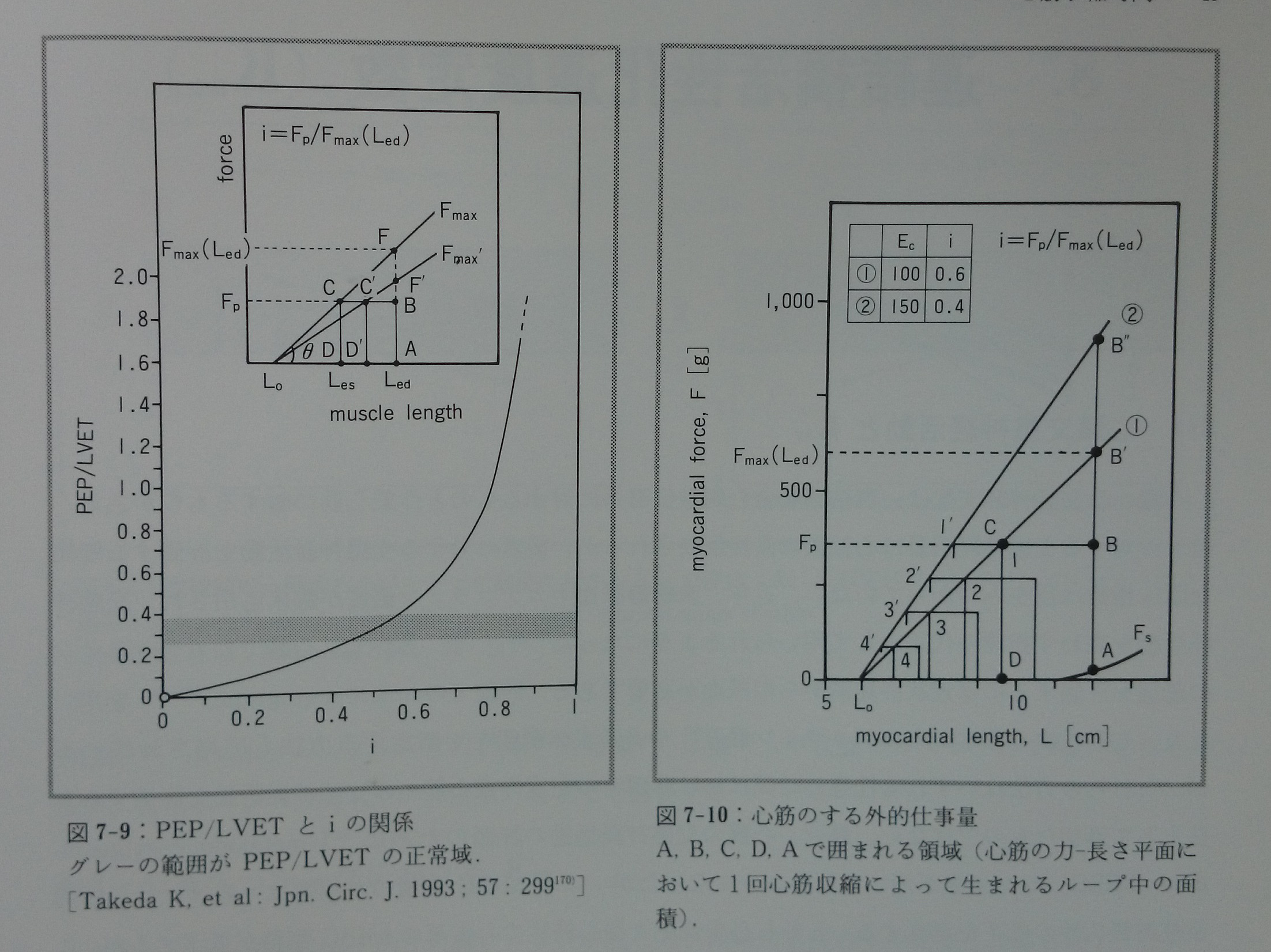 PEP/LVETは心筋収縮性を評価する一つの指標として用いられてきた206, 207)。PEP/LVETは心筋収縮性が低下すると増大し,心筋収縮性が亢進すると低値となる。そのヒトでの正常範囲は0.27から0.39である186)。モデルではこのPEP/LVETは式5-4で表現できる。PEP/LVETはiの関数である170)(図7-9)。図7-9から正常ヒトではPEP/LVETが正常範囲の時,iの値はほぼ0.5前後である。iの値は後負荷(Fp)を初期心筋長における最大心筋発生張力(Fmax(Led))で割ったものであるから(i=Fp/Fmax(Led)= Fp/[Ec(Led – Lo)]),iの値は後負荷(Fp),初期心筋長(Led),及び心筋収縮性(Ec)に依存する。図7-9の内部の図のように心筋収縮性(Ec)の低下によってiの値は大きくなる。また後負荷増大や初期心筋長の短縮によってもiは増加することがわかる。iの関数であるPEP/LVETもiと同様に後負荷,初期心筋長及び心筋収縮性に依存するので,心筋収縮性の指標としては適切ではない。