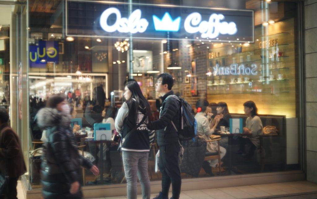 一組のカップルは、厳しい表情で、遠くをじっと見つめている。