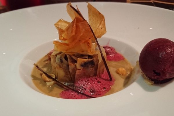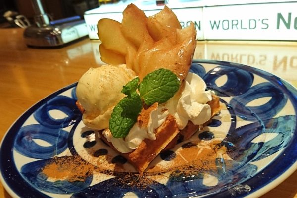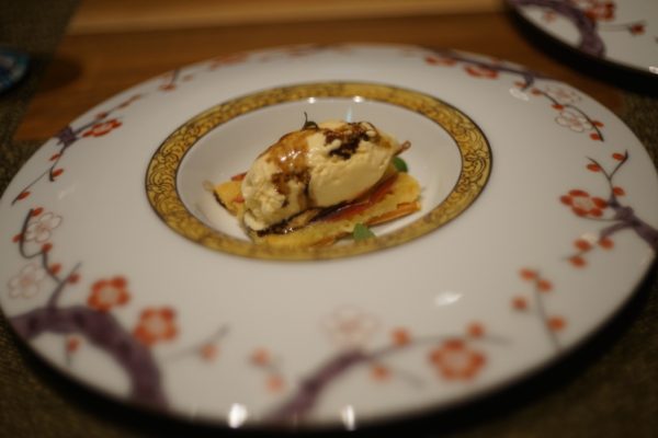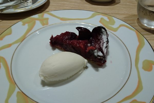 リンゴのタルトの上に ラムレーズンのアイスクリームが載ってい…