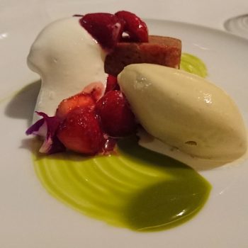 いちご味のピンクのサバランに ホワイトチョコレートのアイスク…