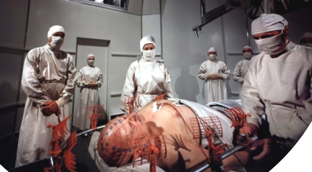 それは、医師と 科学者を乗せて ミクロに 縮小した 潜航艇を、博士の 頚動脈に 注射…潜航艇で 体内を 脳内出血部まで 移動し…患部をレーザー光線 で 治療する という とてつもない 作戦でした…。それにしても、当時から レーザー光線で 治療するという 発想は あったんですね…ちょっと 驚きでした…。