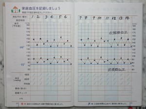測定した血圧の値と脈拍数をノートに記録します。記録方法は写真のように数字を一番下段の枠に記入しておき、血圧値だけは折れ線グラフにします。この折れ線グラフにすることが非常に重要です。