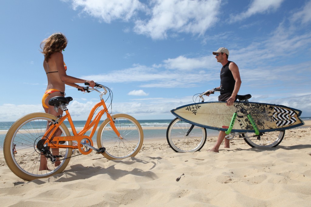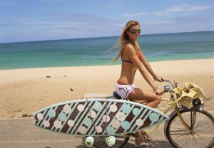地元の若い女性たちは、慣れた様子で海から上がったそのままでサーフボードを横に取り付け自転車で走っていきます。色彩豊かな水着とサングラス、長い髪を背中になびかせ、すいすい車道をすり抜けていく。