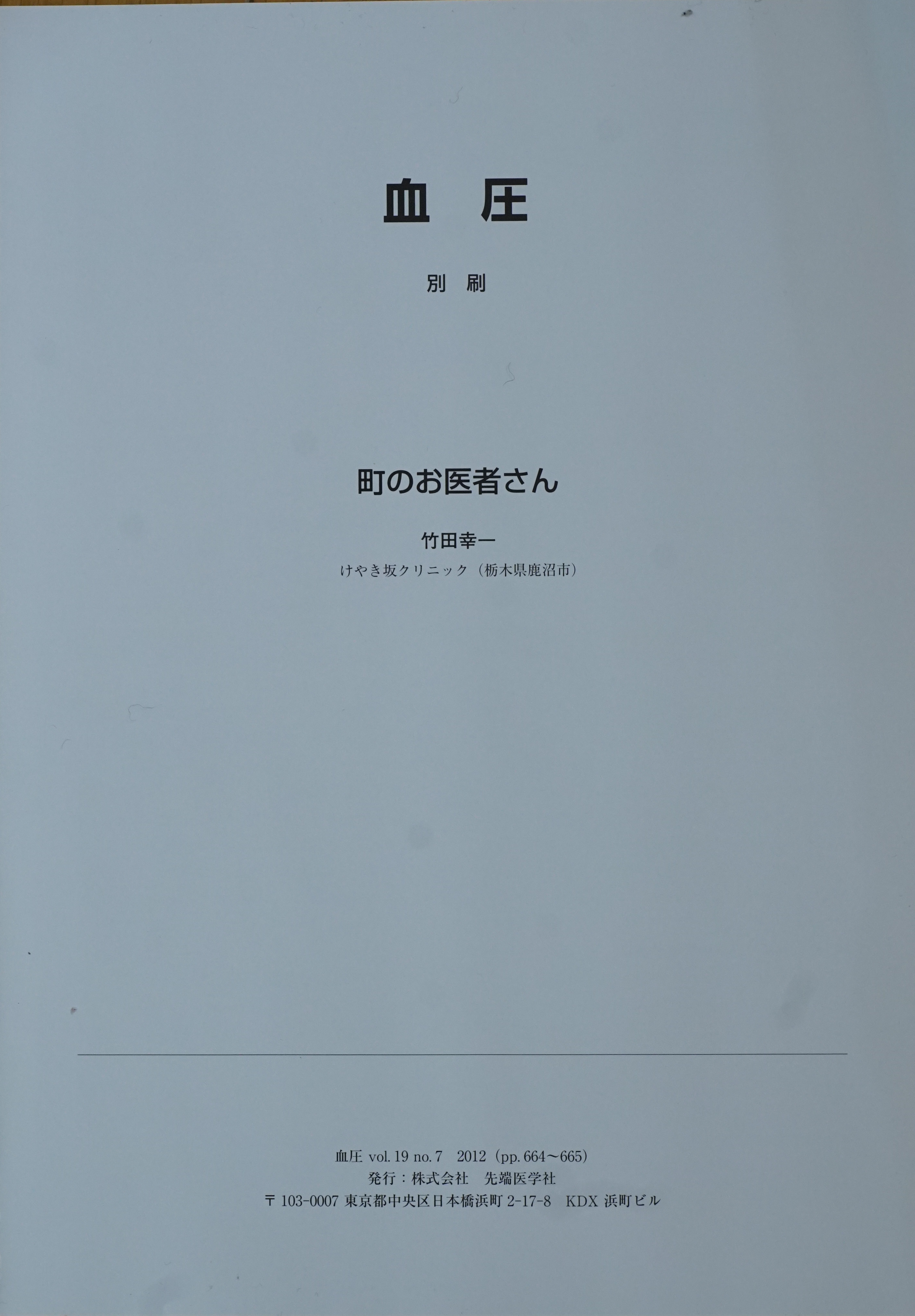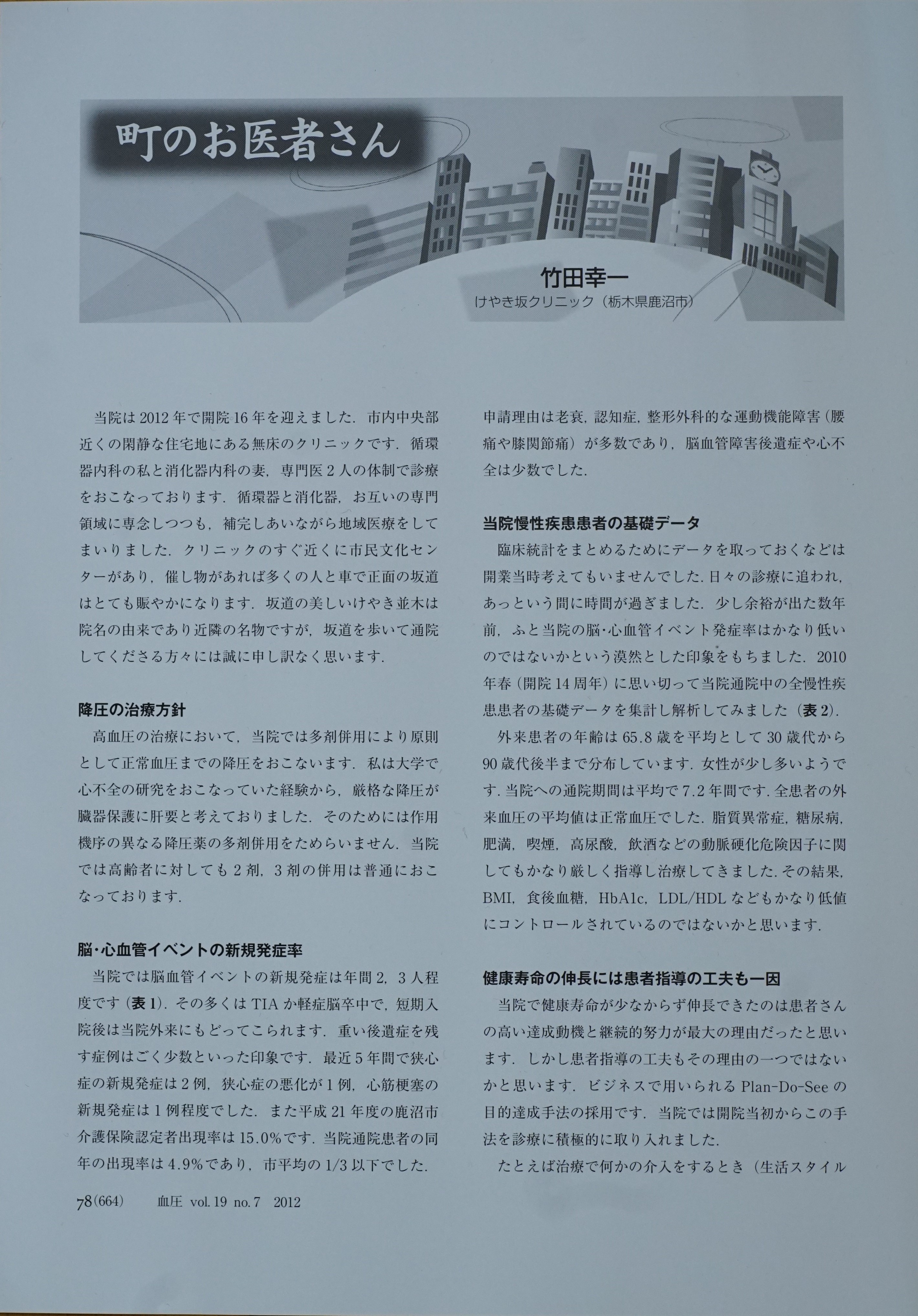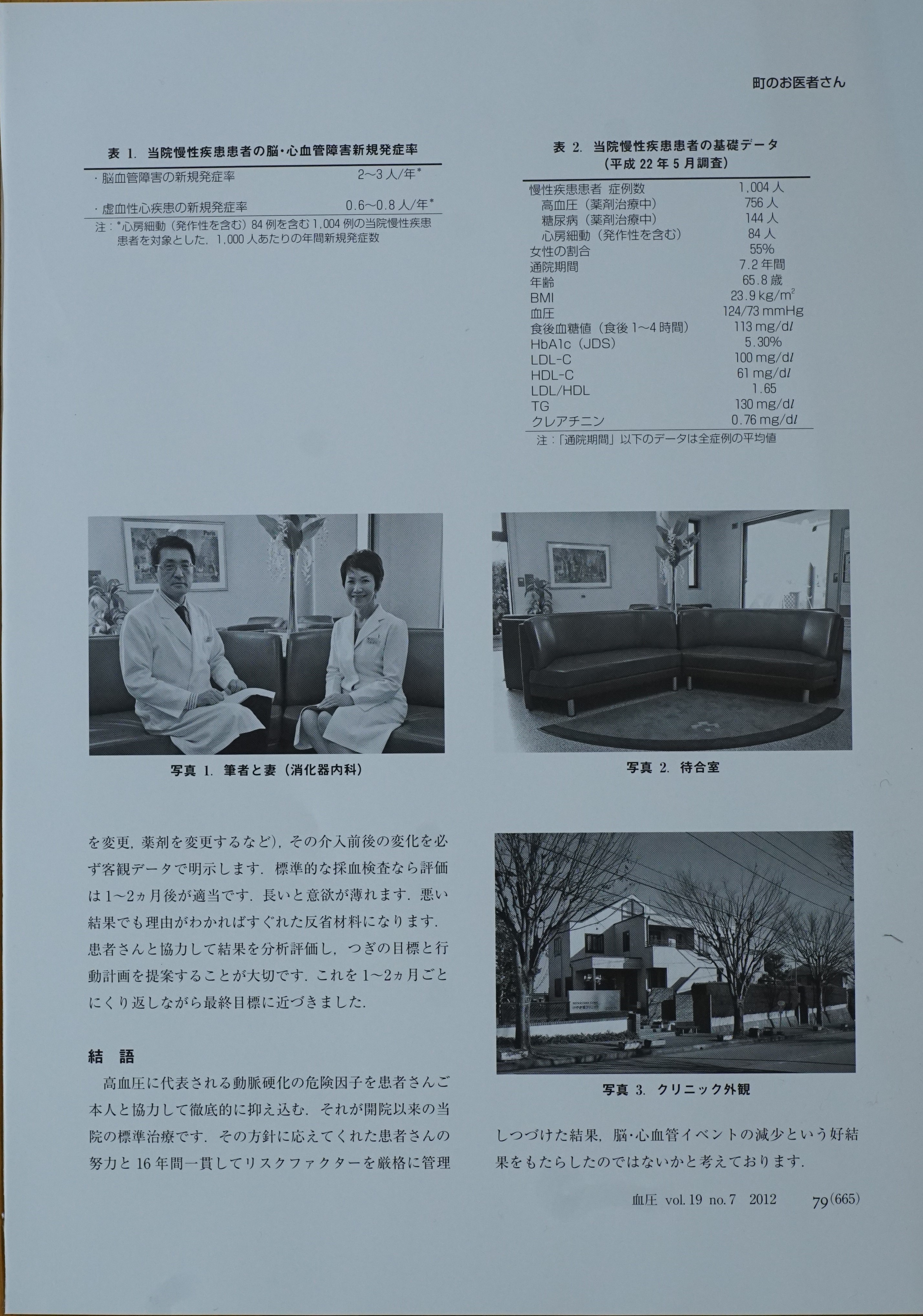 2012年報告のこの記事は当院の紹介コラムですが、その中で当院に慢性の病気でかかりつけの患者さんの、1)臨床的な基本データ、2)脳血管障害と冠動脈疾患の発症率、3)介護保険認定者の出現率を数値で具体的に報告しました。